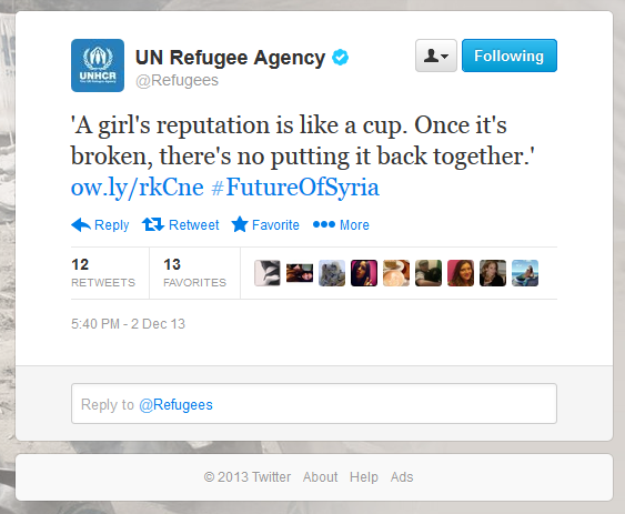 Stunning to see the tweet above, which the Office of the U.N. High Commissioner for Refugees sent to the 1.4 million persons who follow its Twitter feed yesterday. The quote appears to speak to the horror of sexual assault – but not a horror on which we would have expected the UNHCR to focus. Instead of physical harm, psychological trauma, or violation of personal dignity and autonomy, the tweet speaks of loss of “reputation,” as some fragile thing that never can be restored. To reinforce such an outdated stigma, and in so doing to remain silent about other harms, appalls.