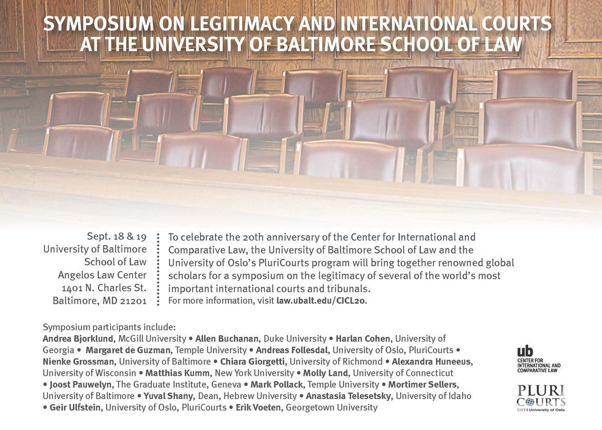 On September 18 and 19, 2014, the Center for International and Comparative Law at the University of Baltimore will celebrate its 20th anniversary. As part of the festivities, it will host a symposium on Legitimacy and International Courts, co-sponsored by the University of Oslo’s PluriCourts program. Speakers will discuss the legitimacy of specific international courts, such as the International Criminal Court, the International Court of Justice, the International Tribunal for the Law of the Sea, and the Inter-American and European Courts of Human Rights, as well as cross-cutting issues such as legitimacy and effectiveness, and legitimacy and democracy. The point of the conference and the book to follow is to think comprehensively and comparatively about the legitimacy of international courts and tribunals. What can we learn from the experiences of specific courts and to what extent are lessons from one court generalizable to other courts?