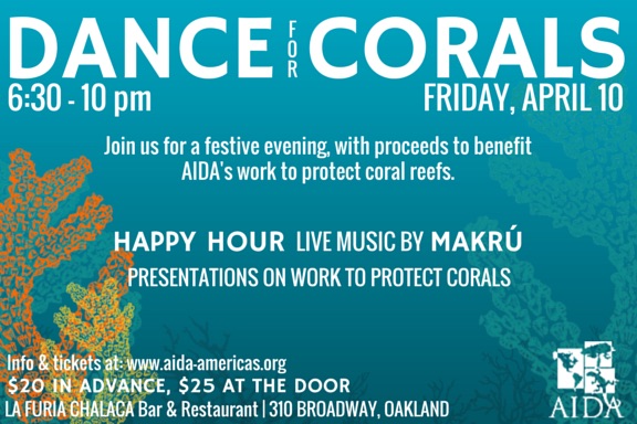 The “Dance for Corals” on Friday, April 10 will be held at La Furia Chalaca, a traditional Peruvian bar and restaurant in Oakland, CA that is accessible by BART and with plenty of free street parking.