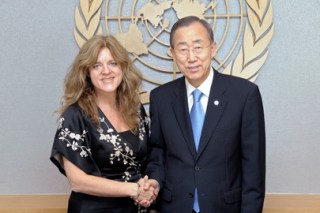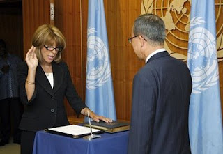 [photos, from top: Secretary-General Ban swears in Patricia O’Brien of Ireland as Under-Secretary for Legal Affairs and United Nations Legal Counsel (credit for 2008 UN photo); Karin Landgren of Sweden, Special Representative of the Secretary-General for Liberia (credit for UN photo); Rima Salah of Jordan, Deputy Special Representative of the Secretary-General, United Nations Mission in the Central African Republic and Chad (credit for UN photo); Secretary-General Ban with Hilde Johnson of Norway, Special Representative of the Secretary-General and Head of the United Nations Mission in the Republic of South Sudan credit for 2011 UN photo by Evan Schneider; Susanna Malcorra of Argentina, Secretary-General’s Chef de Cabinet (credit for UN photo); Ellen Johnson Sirleaf, President of Liberia, co-winner of 2011 Nobel Peace Prize, and co-chair of High-Level Panel just appointed by Secretary-General Ban (photo credit); Korean astronaut Yi So-yeon with Secretary-General Ban and UN flag (credit for 2008 UN photo)]