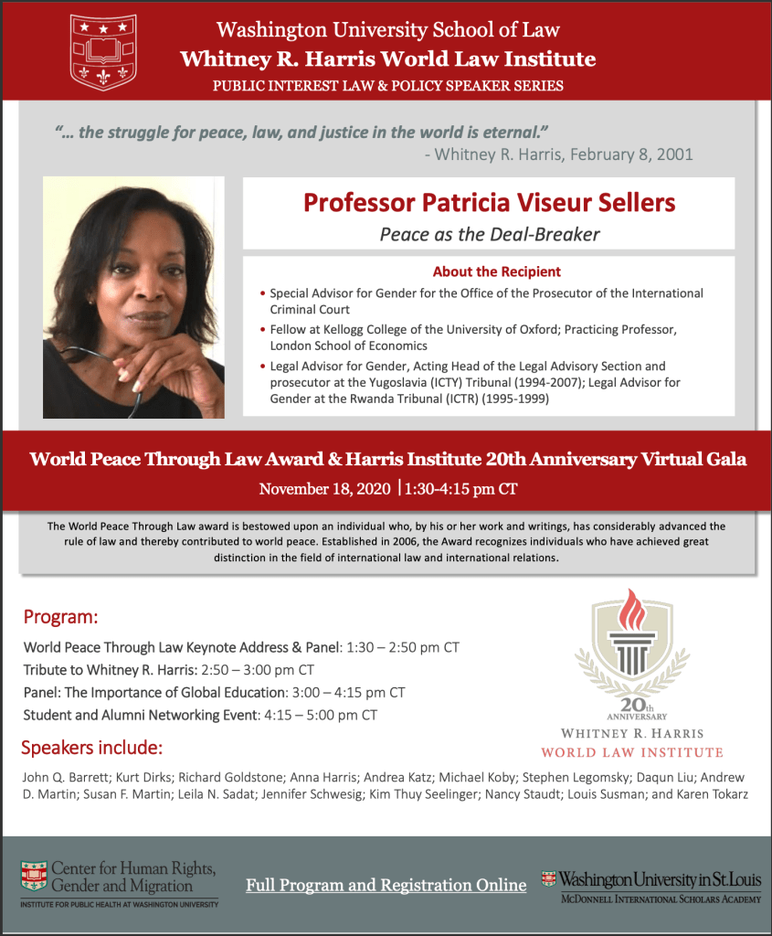 ► The Whitney H. Harris World Law Institute, at Washington University in St. Louis School of Law announced open registration for their upcoming World Peace Through Law Award and 20th Anniversary Virtual Gala, which will be held on November 18, from 1:30-4:15 pm CT. The Harris Institute will be presenting Professor Patricia Viseur Sellers with the 2020 World Peace Through Law Award. Click here for details https://law.wustl.edu/faculty-and-research/whitney-r-harris-world-law-institute/the-world-peace-through-law-award/.