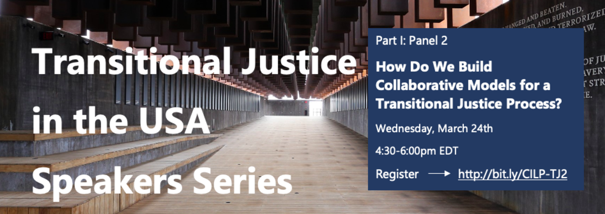 The Center for International Law and Policy’s Transitional Justice in the USA announces its second webinar entitled How Do We Build Collaborative Models for Transitional Justice Process? on March 24, 2021 at 4:30PM (EST). This panel explores how human rights and academic institutions, and their affiliates, can best support an existing grassroots network of racial justice advocates working on themes related to Transitional Justice in the United States in ways that do not replicate the same predominant power structures these movements seek to dismantle.