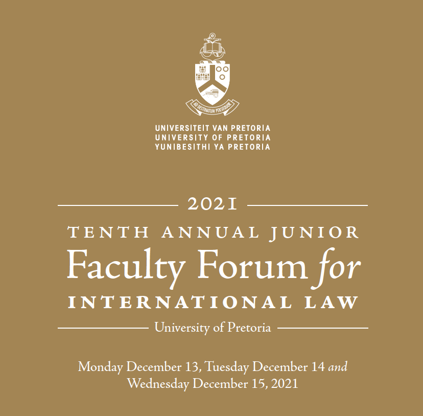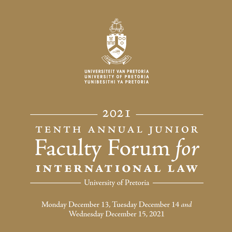 ► The Annual Junior Faculty Forum for International Law is delighted to announce that the tenth Forum will be hosted by the South African Research Chair on International Constitutional Law in collaboration with the Institute for Comparative and International Law in Africa of the University of Pretoria. It will take place on Monday December 13, Tuesday December 14 and Wednesday December 15, 2021, and has been scheduled to coincide with the University of Pretoria Centre for Human Rights Annual Graduation Celebrations. The tenth Forum will have a strong Africa focus: it will be open to junior faculty affiliated with an institution based on the African continent and to those junior faculty based elsewhere whose research specifically relates to the continent. The venue of the Forum will be the Future Africa Campus of the University of Pretoria.