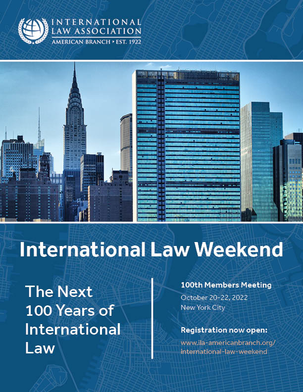 ► The American Branch of the International Law Association (ABILA) is excited to announce that registration is now open for International Law Weekend (#ILW2022) which will be held October 20-22, 2022 in NYC. The unifying theme for ILW 2022, held during the American Branch’s centennial year, is The Next 100 Years of International Law. The conference will feature 35 panels (many of which offer CLE), a High-Level Opening Plenary, multiple keynote addresses, networking opportunities, the 100th Members Meeting, award ceremonies, and more. The Thursday evening Centennial Gala & Dinner and Friday evening UN Mission Reception require separate tickets.