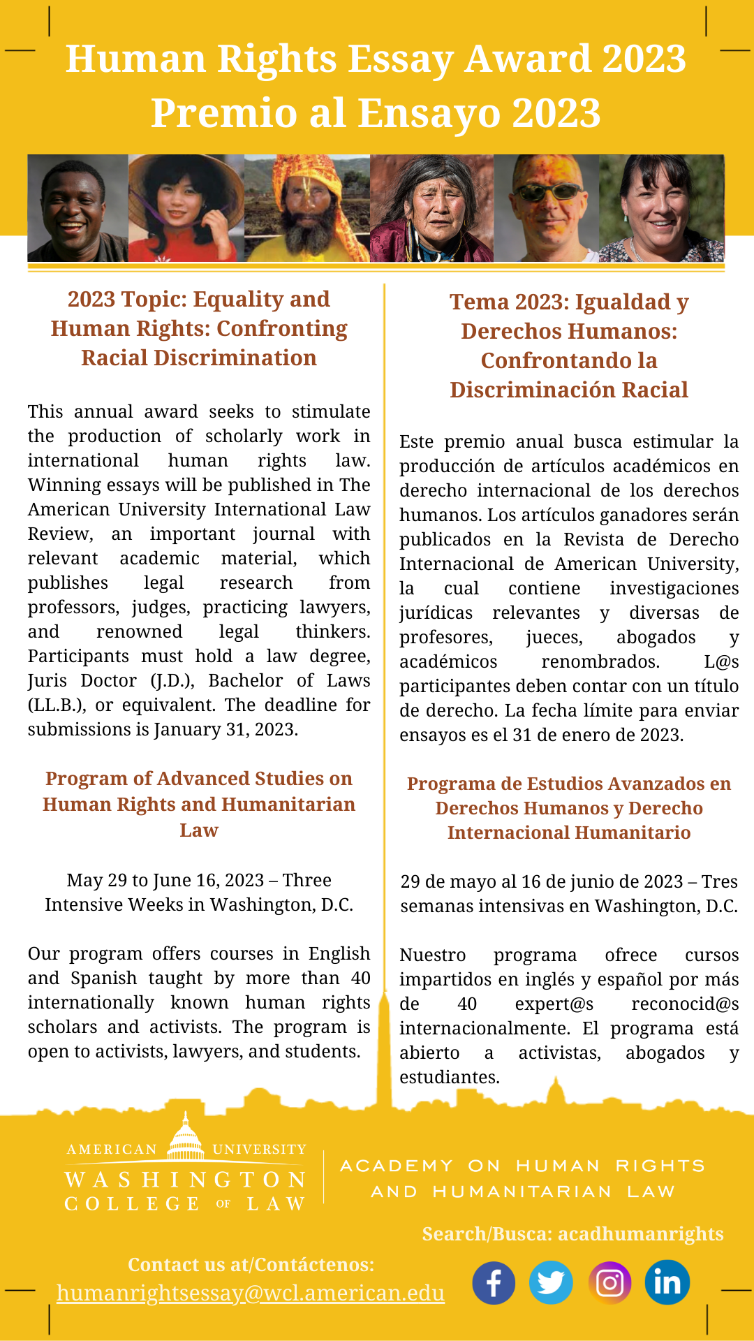 ► If you would like additional information or have any questions, click here or contact via email at humanrightsessay@wcl.american.edu. Social Media: acadhumanrights