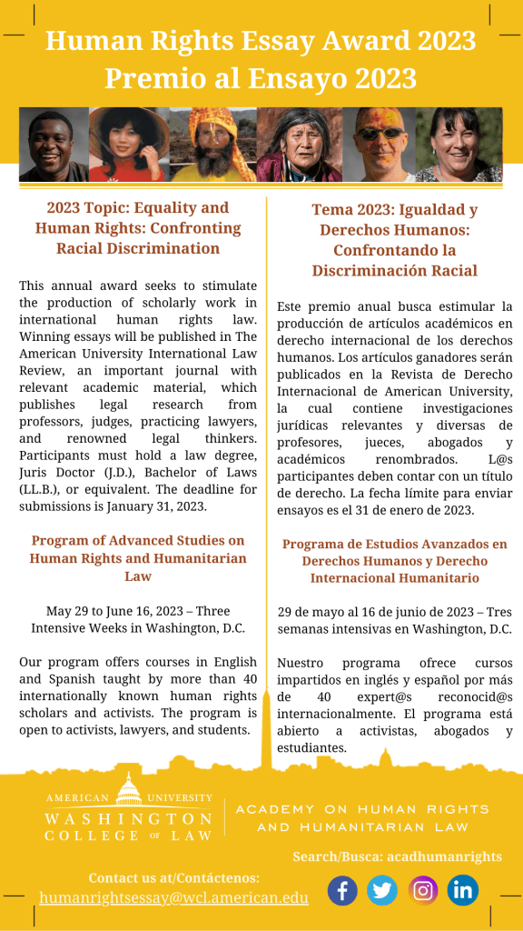 ► Academy on Human Rights and Humanitarian Law of the American University Washington College of Law, U.S.A is accepting submissions for The Human Rights Essay Award, which seeks to stimulate the production of scholarly work in international human rights law. The topic of the 2023 Award is “Equality and Human Rights: Confronting Racial Discrimination”. Participants have the flexibility to choose any subject related to this topic, however, the scope of the essay must directly relate to the 2023 topic, or it will be disqualified. In addition, organizers would like to note that international human rights law can be understood to include international humanitarian law and international criminal law. The deadline to enter your submission is January 31, 2023. Winning essays —in English and in Spanish— will be published in The American University International Law Review (AUILR). The AUILR is an important journal with relevant academic material, which receives approximately 1,500 submissions annually and publishes a wide range of legal scholarship from professors, judges, practicing lawyers, and renowned legal thinkers. Please note that this competition is open to lawyers around the world. However, only participants with a law degree —Juris Doctor (J.D.), Bachelor of Laws (LL.B.), or equivalent— are eligible to enter the competition.