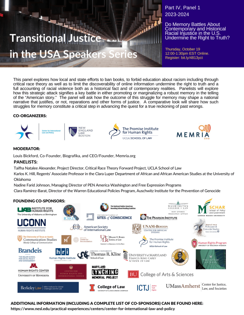 The first panel of Part IV of the Transitional Justice in the USA Speakers Series is scheduled to take place remotely on Thursday, October 19 (12-1:30 EST) entitled: Do Memory Battles About Contemporary and Historical Racial Injustice in U.S. Undermine the Right to Truth?The Center for International Law and Policy co-organized this panel with the Promise Institute for Human Rights at UCLA | School Of Law and Memria.Org.